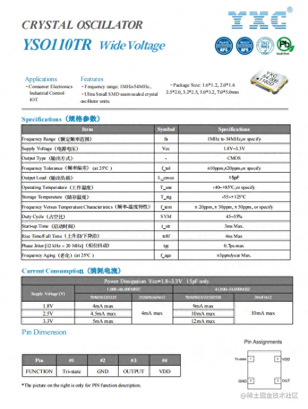 针对视频编码器和视频解码器应用,推荐选用扬兴科技(YXC)有源晶振YSO110TR系列,频率范围为1-125MHz,频率稳定度±30ppm,低抖动0.7pS max., 宽工作电压范围1.8-3.3V,工作温度-40~+85°,封装尺寸覆盖1612-7050,具备高稳定度、低抖动、灵活匹配不同封装尺寸和电压需求的特点,系列规格参数如下: