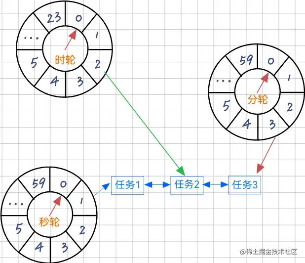比如说上图中:任务二要在第 2 小时执行,所以任务二就会在时轮转到 2 的时候再放入分轮中去,分轮转到 3 后再放入到秒轮,然后秒轮就在 1 的时候执行了任务2。