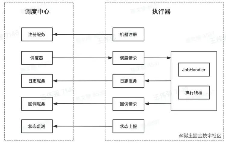 - 调度器发出调度请求,执行中心进行任务执行,中间可能会回传日志文件,也可能发出回调请求