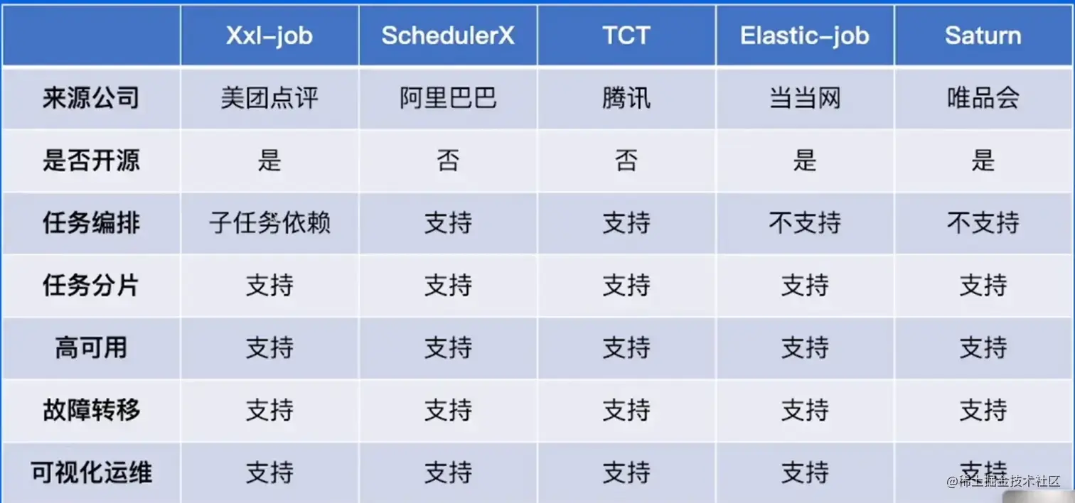 - Xxl - job : 开发迅速,易拓展,支持分片,支持简单的任务依赖和子任务依赖,不是跨平台的。开源免费,轻量级,开箱即用,操作简单易上手,在中小型公司使用广泛。