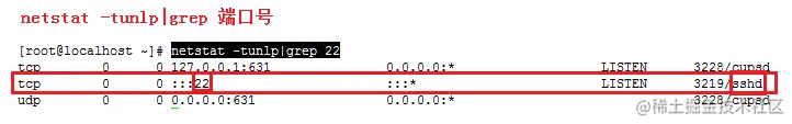 netstat -tunlp|grep 端口号,用于查看指定端口号的进程情况,如查看22端口的情况,d