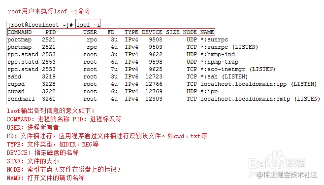 lsof -i 用以显示符合条件的进程情况,lsof(list open files)是一个列出当前系统打开文件的工具。以root用户来执行lsof -i命令,如下图