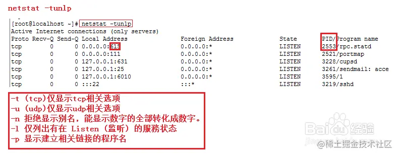 netstat -tunlp用于显示tcp,udp的端口和进程等相关情况,如下图