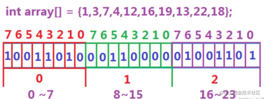 对于上图来说,有一个整形数组,我们可以使用直接定址法对数组的数据进行映射,但是与之前不同的是,此时只是使用一个比特位来代表一个整形数据,当这个数存在时,比特位置1,不存在时,比特位置0,此时就可以大大节省空间资源,无符号整数只有2的32次方个,所以最多开2的32次方个空间,一个空间为一个比特,所以最终只需要512MB的空间。但是我们不能按照位来空间,最少必须一个字节,所以我们就每次开一个字节的空间,也就是8个比特位,将8位当做一个整体来处理,对要保存的数据除8就是第几个字节,对保存的数据模8就是在这个字节中的第几个位置。