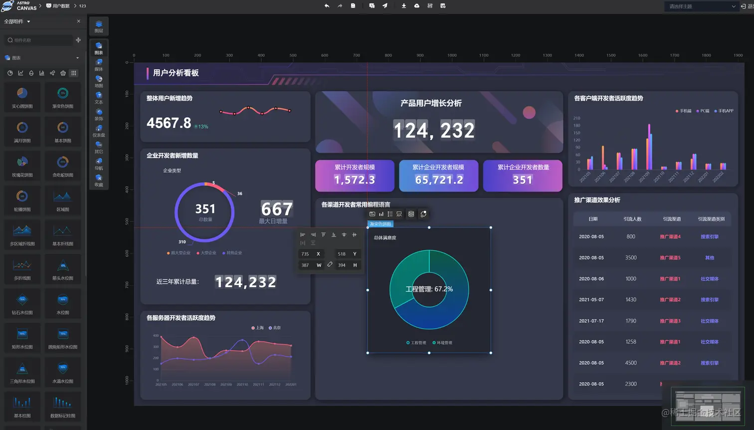进入编辑页面后,可通过选择左侧的编辑界面,选择想要的控件进行拖拉式操作,将其拖入页面中后,可点击控件进行进一步的编辑