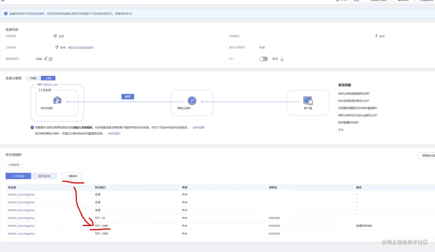 这是最坑人的地方 在第一次进行反复查找后,发现只要这里选择一件添加,3306端口就会联通,前面的规则添加与否并不重要(貌似手动添加的话可以定义优先级)