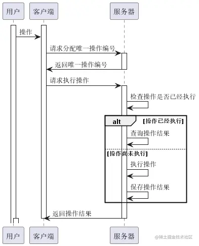 可以看到幂等操作分两步:分配编号、执行操作。需要说明一下,这里提到的幂等性是从业务状态变更的角度讲的。业务状态是类似用户名、账户余额这类具有业务意义的数据。操作编号本身没有业务意义。无论分配了多少个编号,业务状态都没有改变,因此分配编号行为被认为是幂等的。在执行操作这一步,有了唯一编号就可以确认操作的执行状态,保证只有首次请求时操作才会得到执行。后续请求只是在读取首次执行的结果,也没有改变业务状态,因此也是幂等的。