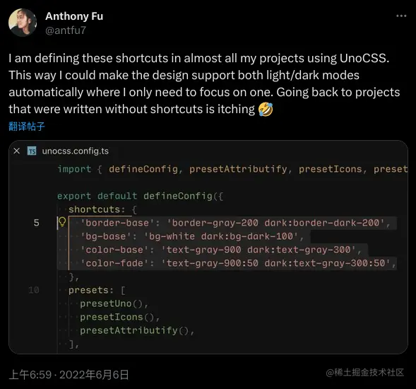 如果你想要在 UnoCSS 中使用亮暗色主题,需要在配置文件中进行设置。我使用的方法参考了该框架作者 Anthony Fu 的一条推文。