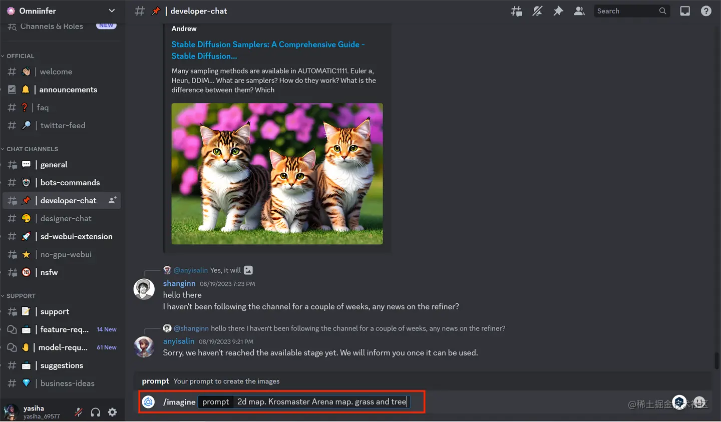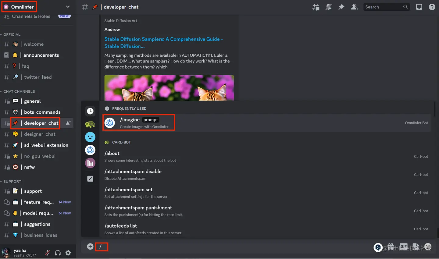 discord机器人:首先在Omniinfer的discord任一个聊天频道的聊天框中输入斜杠,接着点击/imagine,然后输入提示词,接着等待图片生成即可