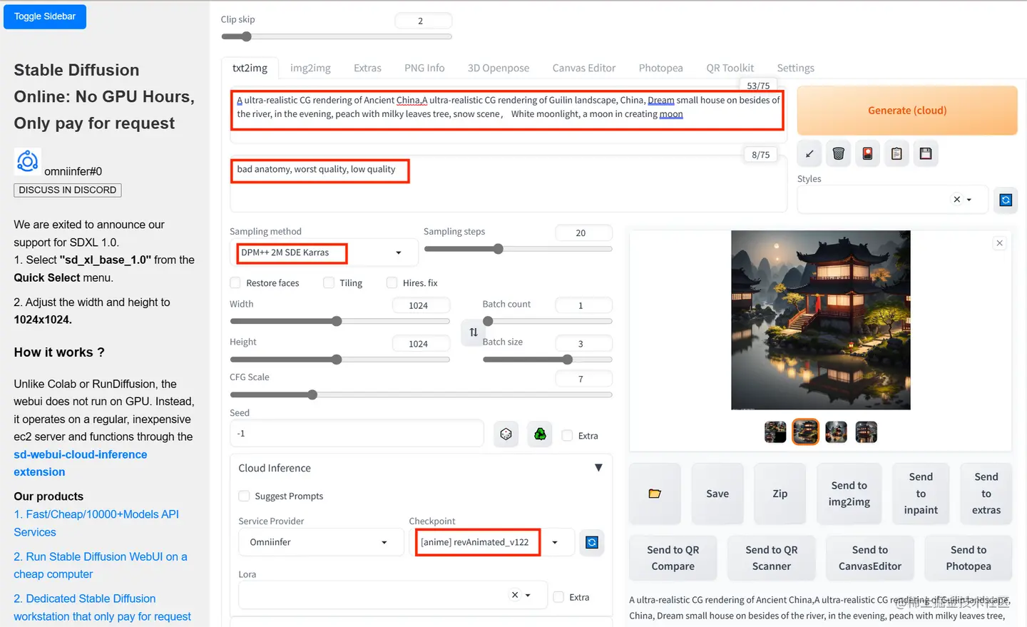 No GPU WebUI:首先输入正向和反向提示词,接着选择DPM+2M SDE Karras,模型选择revAnimated_v122,即可生成风景图片。
