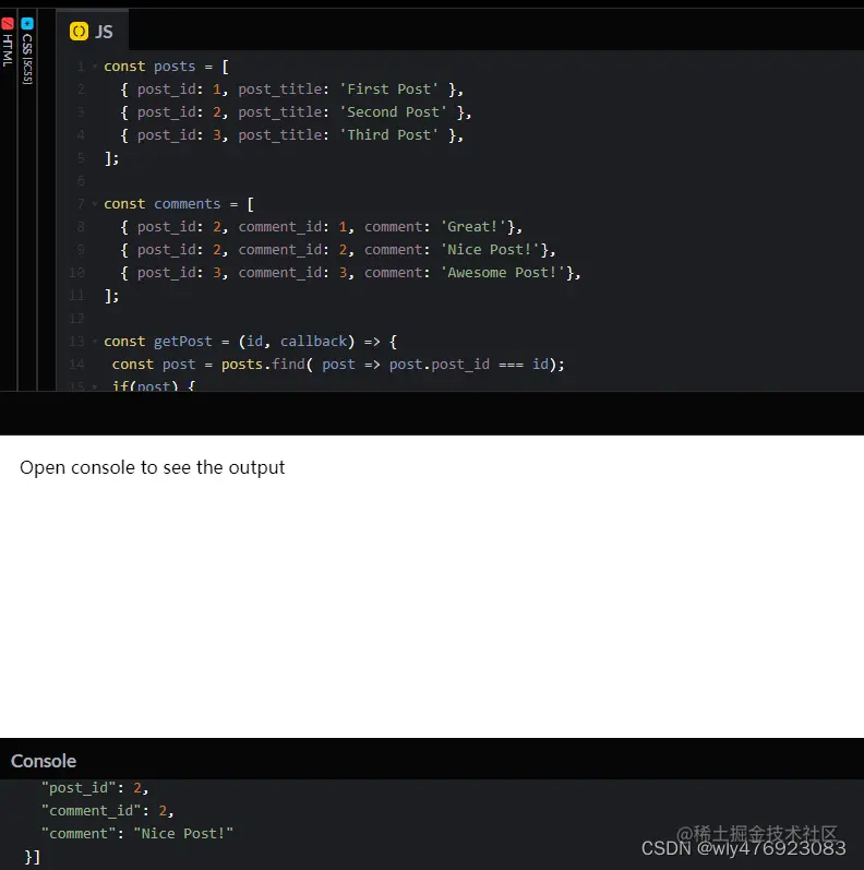 正如您所看到的,我们将getComments函数嵌套在getPost回调中。