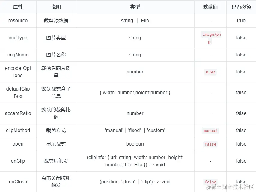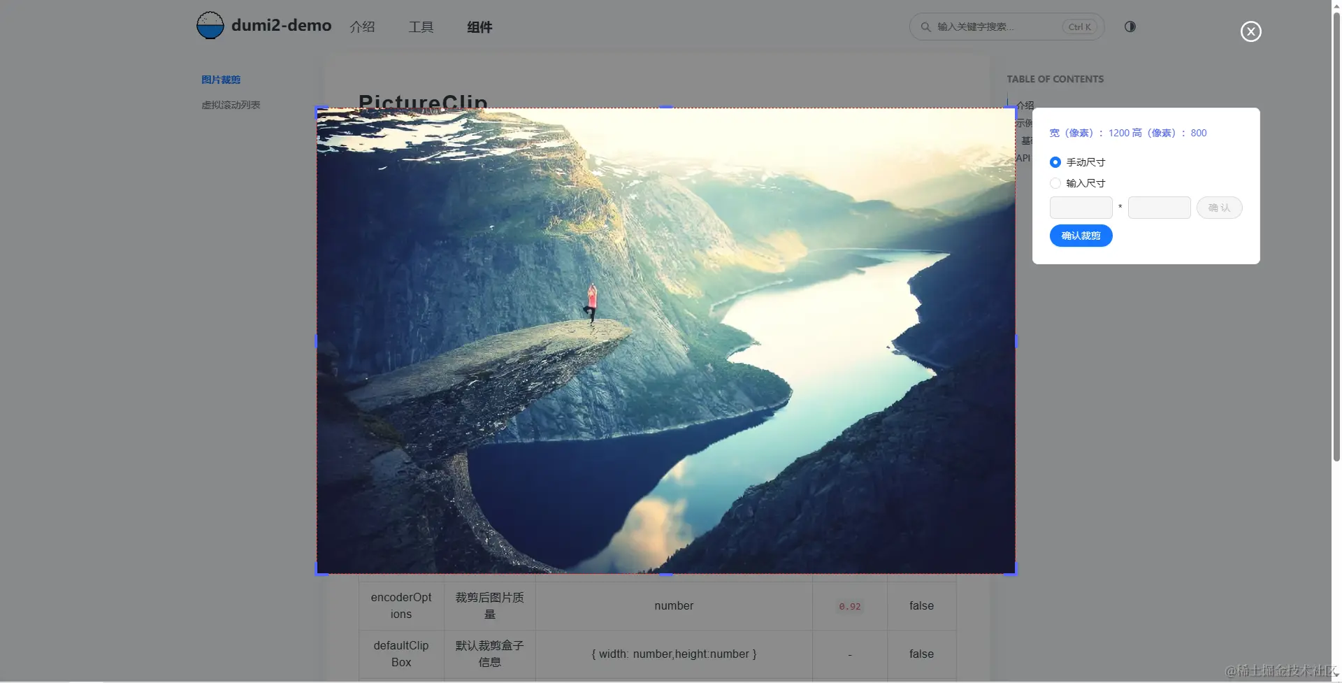 这是一个灵活实现图片裁剪功能的组件,点击按钮即可上传图片进行裁剪,图片源既可以是链接,也可以是文件。该组件借助canvas画布,实现手动拉拽进行裁剪,或者输入图片尺寸进行裁剪,提供了更多的自由度和定制性。其中,组件参数和呈现效果如下所示: