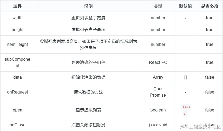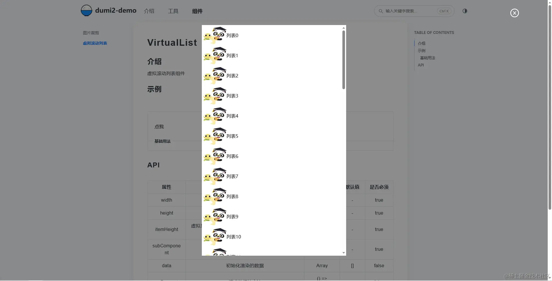 这是一个灵活实现虚拟滚动列表的组件,除了实现常规的虚拟滚动列表功能外,还使用到了一些自定义hook,提高渲染性能的同时也提供了足够的灵活性、方便开发者根据实际需要灵活地修改组件源代码。其中,组件参数和呈现效果如下所示:
