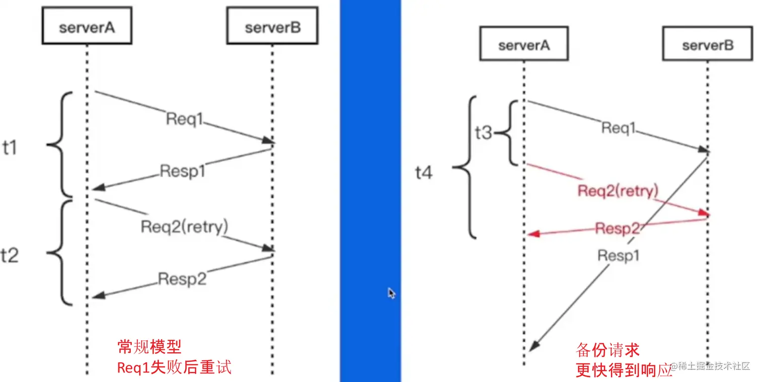 - 在超过阈值且没有收到响应时,立即发送备份请求Req2进行重试,如果备份请求正常返回,那么不必等待长尾请求的结果。