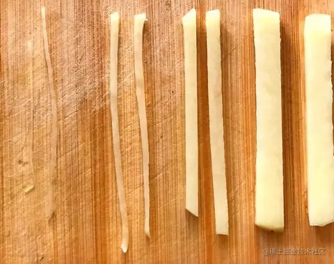 3.有人说刀功不好,切不细。其实也不要切的过细,并不是越细越好,正常家庭烹制只要切到筷头1/4粗细就行了,如上图中间两个。右一是条,最后那太细,加热后容易过熟。