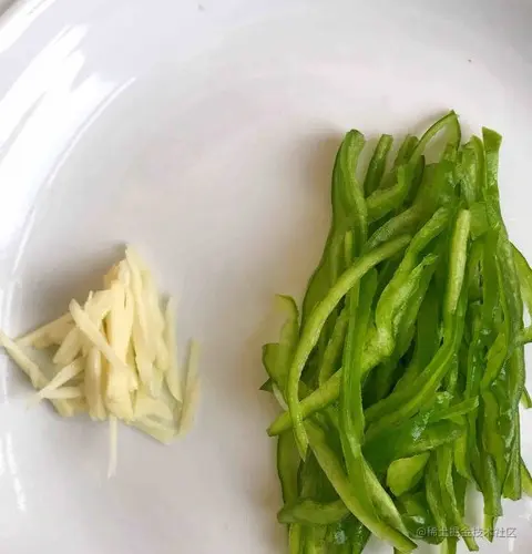 5.青椒和蒜瓣切丝备用,这里说一下配菜宗旨:丝配丝,块配块。