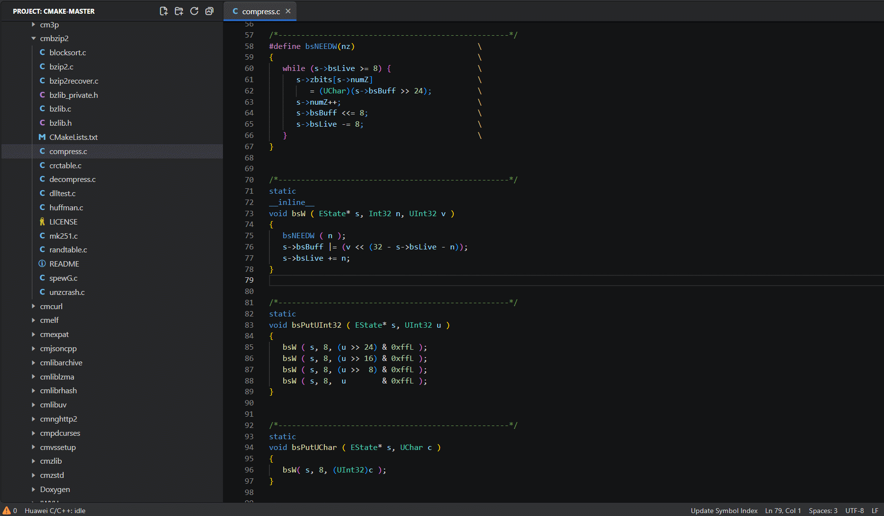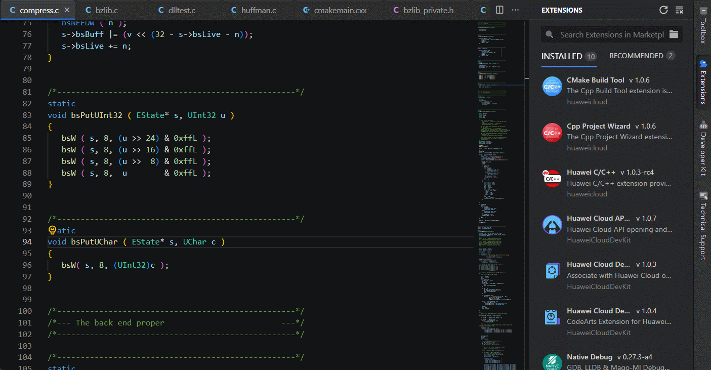 CodeArts IDE for C/C++ 包含了内置的符号重命名,提取重构,代码补全/提示,实时语法检查等一些高级代码编写功能。