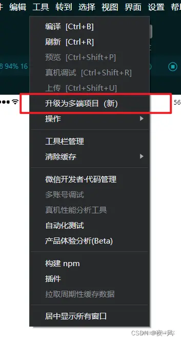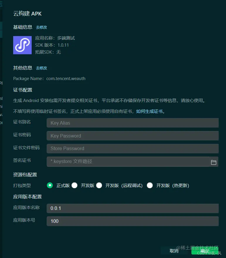 微信开发者工具打包App了 夜_风 2023-08-22 207 阅读1分钟 微信开发者工具打包App了 微信开发者工具升级到最新版本 创建小程序项目 初次使用会提示绑定去Donut平台绑定 点击“工具”选项中的“升级为多端项目” 编辑 升级完成的状态栏 编辑 项目会自动编译 点击构建编辑 点击打包APK编辑 证书别名,证书密码,证书文件密码,签名证书为必填项 点击确定后提示编辑 可以选择保存目录后会进行自动编译 目前正在测试新功能如何用~~~~~~