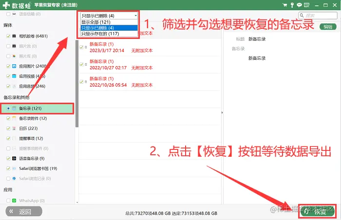 步骤2:在扫描完成页面,找到**【备忘录】选项,将范围缩小至【只显示已删除】即可查看之前删除的备忘录,然后点击【恢复】**就可以导出备忘录了。