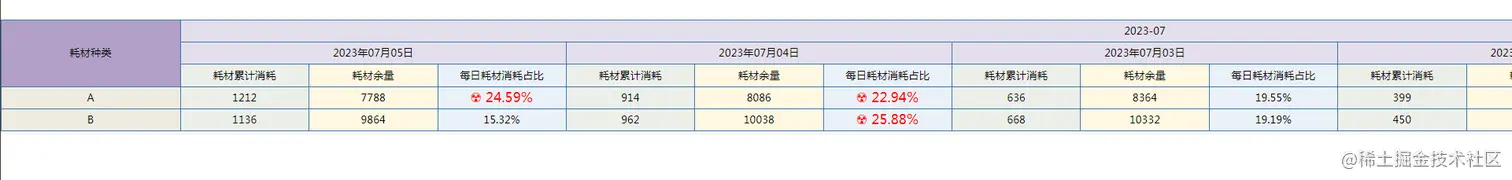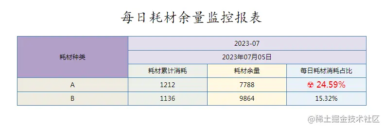 和上一篇文章一样,为了让大家更好的理解,我将以工厂的耗材损耗数据作为查询条件背景:假设现在有某个工厂刚刚完成了一次耗材的加工,在加工的过程中记录了耗材分类,每日的记录时间、每日的耗材耗损数和当月的月初耗材供给量,如下表所示: