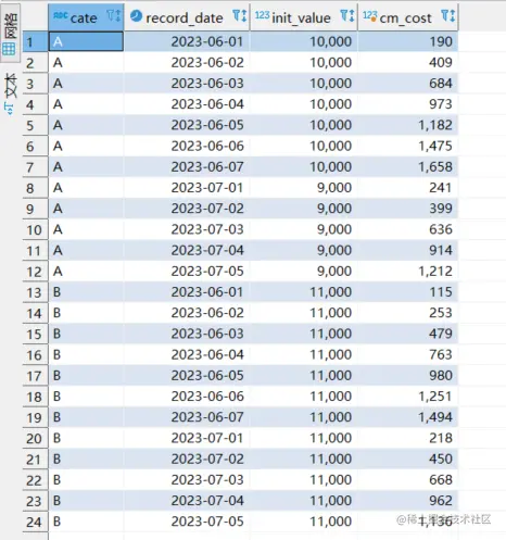 小编为大家拆解一下这个代码,第一个 ROWS 表示接下来的 Frame 窗口指定为行模式, BETWEEN 关键字表示接下来的语句效果是指定 窗口范围, UNBOUNDED 和PRECEDING 是两个关键字的组合,前者表示 该计算窗口在 ↑ 方向的边界为最顶部,对应到 partion by 分区中 6 月份的计算域,UNBOUNDED PRECEDING 表示6月份每一行的窗口上界为 order by record_date 顺序下的最小值,即 2023/06/01号的记录, 同样的 接下来的 AND CURRENT ROW 则指定了计算frame 窗口的 ↓ 边界为当前行。 最后我们重新梳理下这个计算窗口, 在每月每个分类的计算分区下,每一行的计算窗口为 从本月的最小日期 到当前行的所有记录,,联系到最开始 SUM(cost) 聚合就能够理解 为什么这条 SQL 能计算出对应的累计值了。