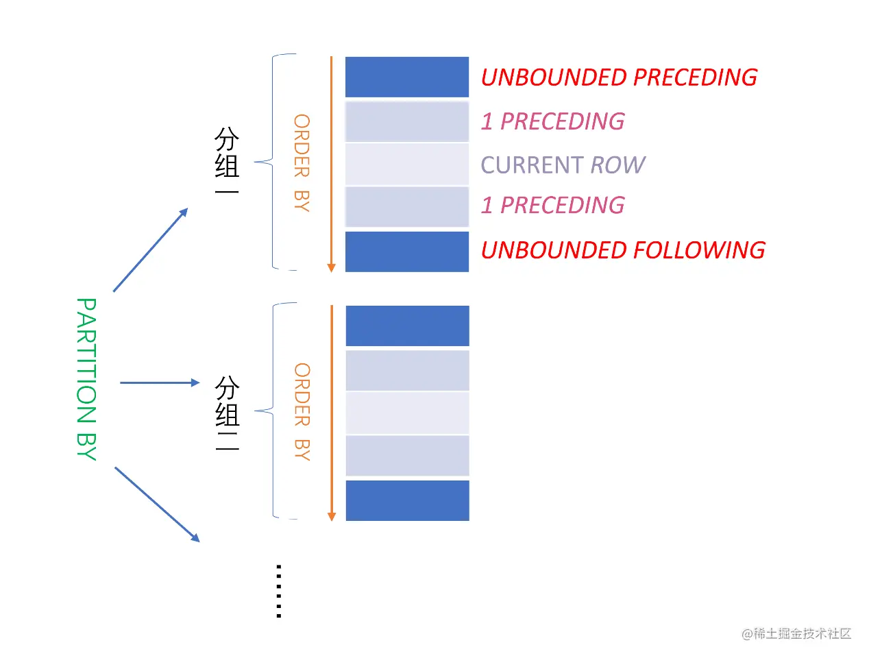 这里可以扩展说明一下,确定计算窗口大小的关键字 除了UNBOUNDED PRECEDING和CURRENT ROW 之外还有 UNBOUNDED FOLLOWING, 如果 UNBOUNDED PRECEDING 表示上边界的顶部, 那 UNBOUNDED FOLLOWING 就表示下边界的底部。所以如果指定计算窗口为 ROWS BETWEEN UNBOUNDED PRECEDING AND UNBOUNDED FOLLOWING, 则表示在整个分区计算域中进行聚合运算。另外, UNBOUNDED 其实是非必须的, 这里可以替换为任意数字表示 针对当前行的偏移行数。比如 1 PRECEDING 表示 当前行的上一行, 1 FOLLOWING 表示当前行的下一行, 我们通过指定计算窗口为 ROWS BETWEEN 1 PRECEDING AND 1 FOLLOWING 就能计算 每一行从上一行到下一行之间这三行的累计值。至于说 CURRENT ROW 则指定为当前行,这也是为什么能做累计求和的关键。