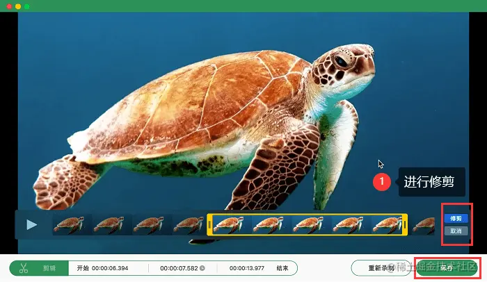 第3步:完成录制后,点击 “结束” 按钮,视频将弹出预览,你可以对录制的视频进行修剪,然后保存到电脑文件夹中。