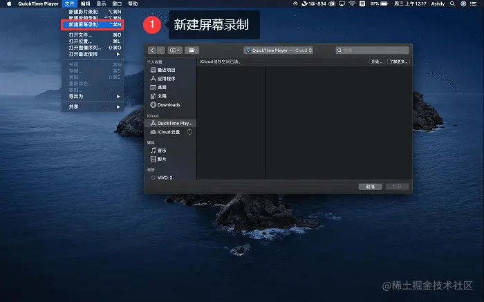 第2步:在 “QuickTime Player” 菜单栏中,选择 “文件” 选项,然后点击 “新建屏幕录制” 。在屏幕录制窗口中,您可以选择录制的屏幕区域,包括全屏或自定义区域。您还可以选择是否录制麦克风音频。