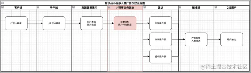 所谓多元化,就是复用度,加工好的这些数据,可以给下游的团队接入使用,比如商智,黄金眼,数纺这些团队。以小程序广告投放为例,在小程序数仓中我们构建了各个类型的用户群体,在数纺注册了用户群体标签,比如关注用户,粉丝用户或者提单用户等,下游的广告精准通系统会基于我们的这些标签进行人群的圈选,进而实现小程序广告的投放。