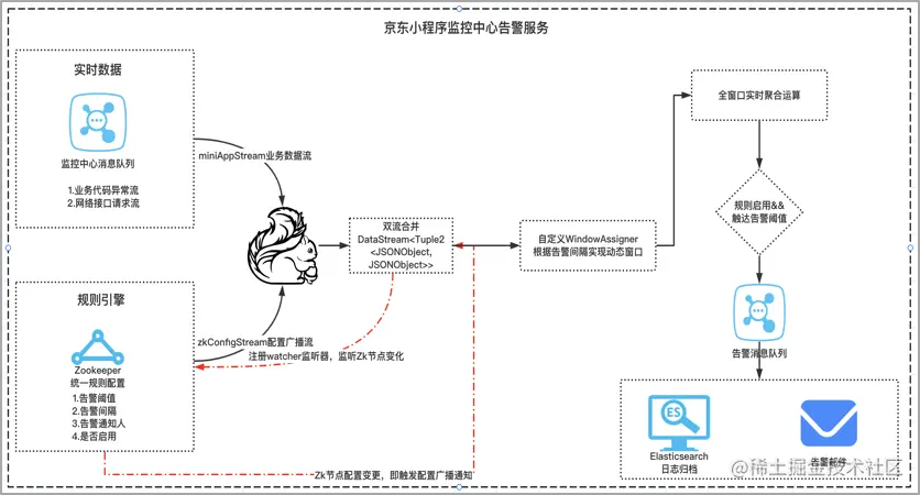 1.报警规则可配置,基于Zookeeper分布式配置中心存储小程序自定义的告警规则,实时监听规则节点变化,当节点数据变化时,实时聚合到业务流;