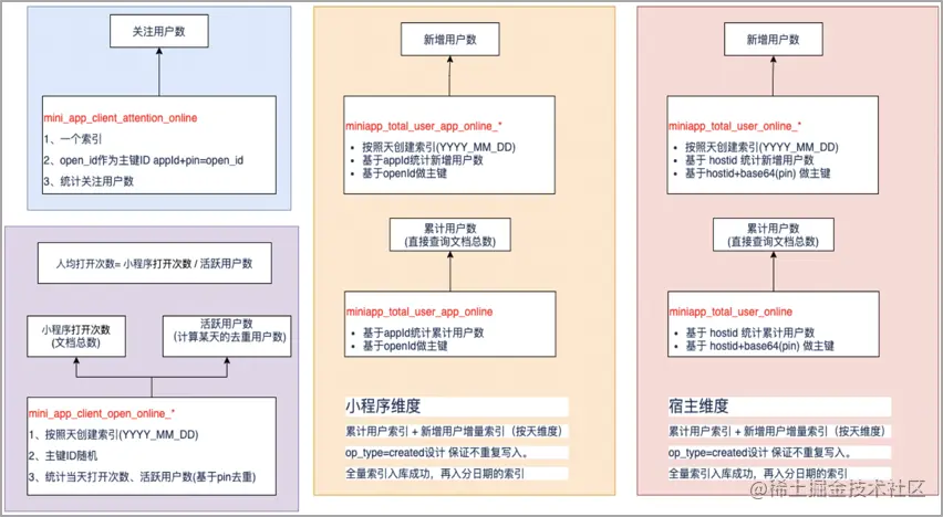 在构建小程序的新增用户的指标时,利用了ES索引碰撞的原理,设置操作类型operateType为create,create的语义是重复创建指定文档id的内容,第二次执行创建会报错(出现主键碰撞),这样的话,保证新增用户的记录在ES索引中只出现一次。