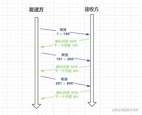 数据包被拆分成多个小的数据包之后,数据包发送都有返回一个确认序列号,每次发送一个新的包,都等待上一个包的 ACK 回来之后才能发送,这样一来一回的效率是很低的: