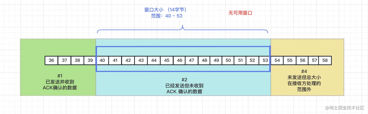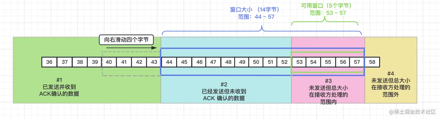 随着 ACK 的确认,窗口也会依次向右滑动,比如发送端的窗口中,比如 40 ~ 43 字节都收到了 ACK 确认,那么整个可用的窗口就会顺次往右移动。此时 53 ~ 57的数据也都能发送了。
