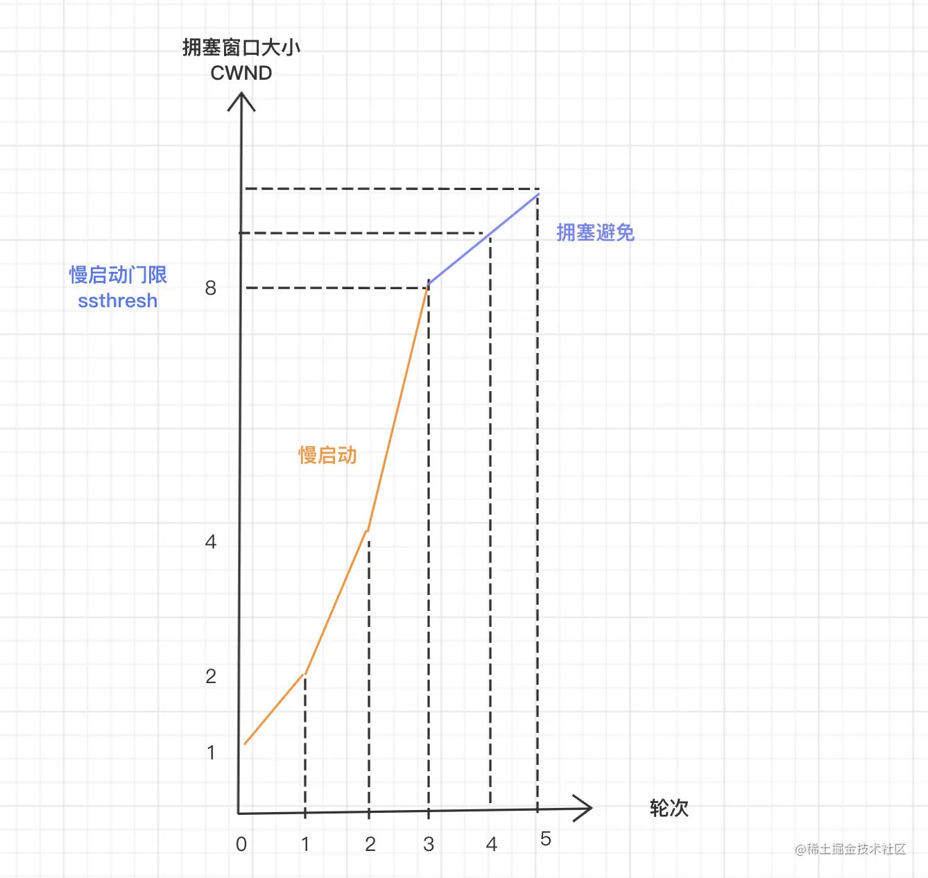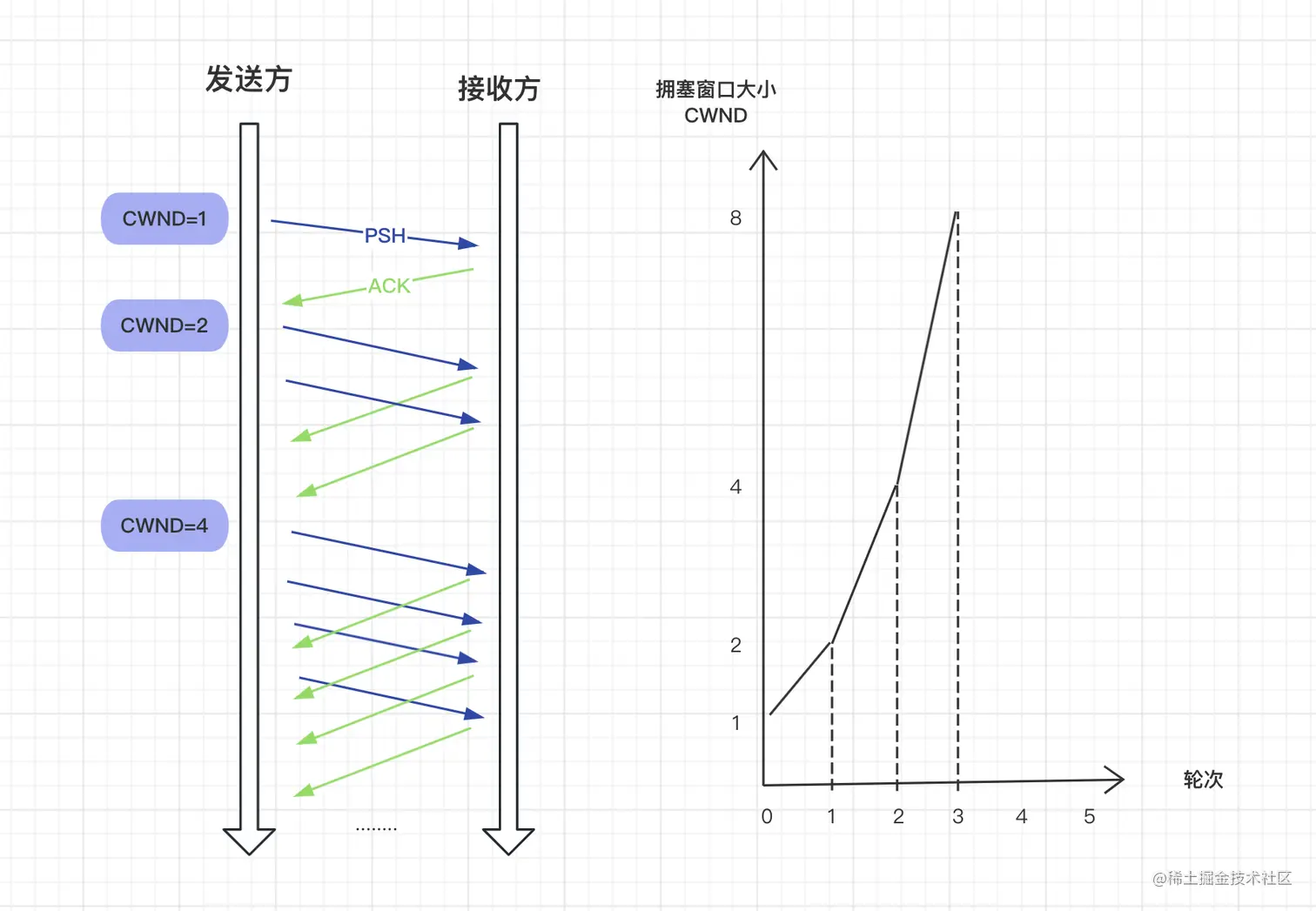 当一个新的TCP连接开始时,无法确定是否用拥塞发生,一开始不会发送大量的包,而是从最小的发送窗口开始,后续会采用倍增的方式增加窗口的大小,窗口大小从 1 开始,后续慢慢增大到 2、4、8 等。