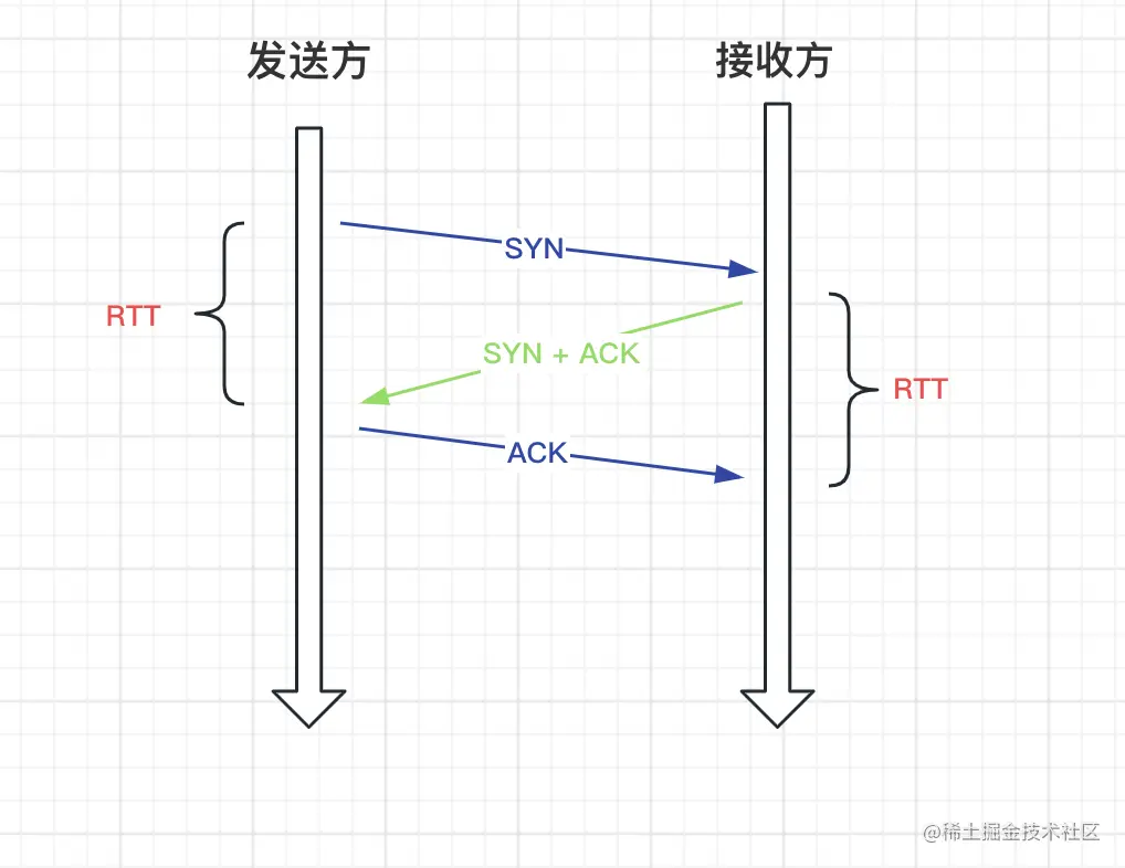 RTT Round-Trip Time 表示往返时间,表示网络一段到另一端所需要的时间,也就是数据包的往返时间,以 TCP 握手为例: