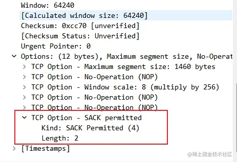 这种方式需要 TCP 报文段选项加一个 SACK 字段,使用查看 Wireshake SYN 包中 SACK Permitted: