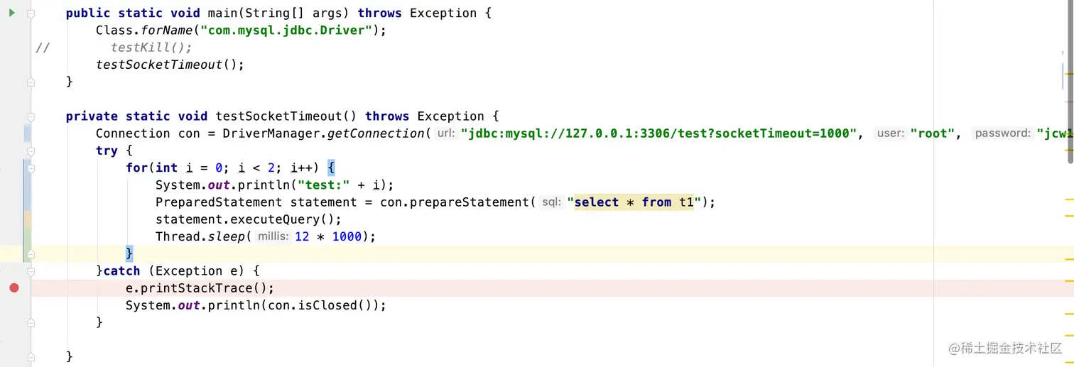 验证源码如下,让两条sql执行时间超过10s,可以发现第二次执行sql时执行报错了