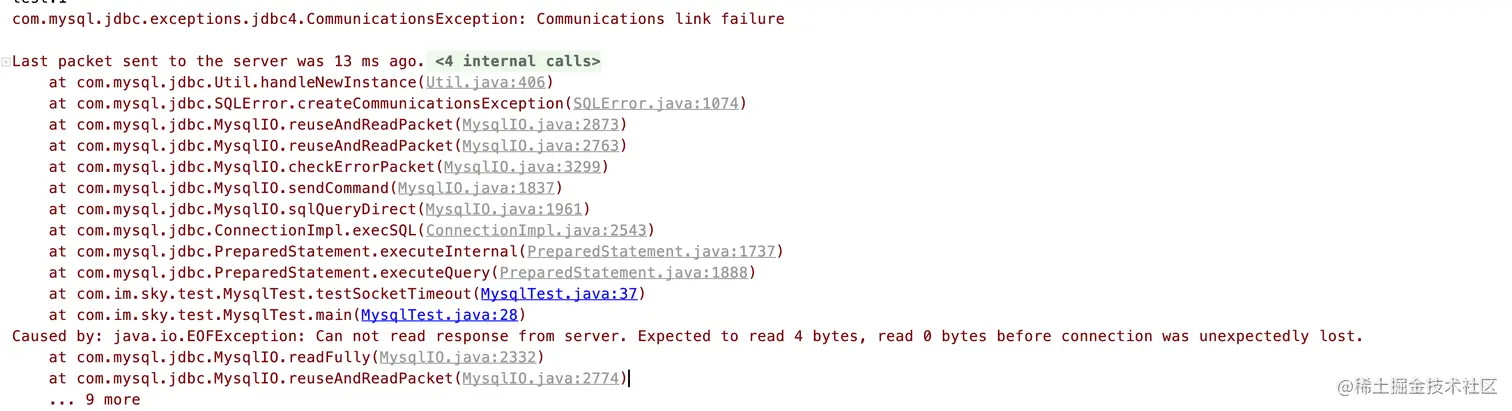 之前线上用的是mysql,通过mysql驱动包直连数据库,数据库服务端默认连接空闲时间是8小时,后来响应公司号召,将传统的mysql切到了jed(底层也是mysql), jed由于网关层的存在,客户端是通过mysql驱动包跟网关层进行直连,网关这一层数据库空闲连接超时时间仅仅10分钟,当时在客户端进行空闲连接探活时间超过10分钟,导致数据库报错频繁。现在已经找不到历史的数据库异常日志了,本地模拟了一下,验证如下: