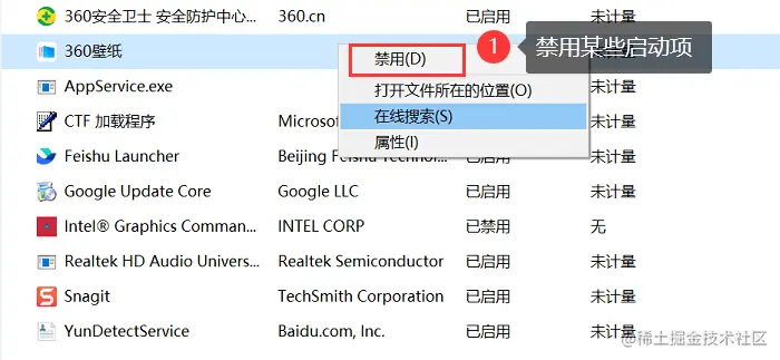 - 切换到【启动】选项卡,禁用你认为不需要自动启动的程序。