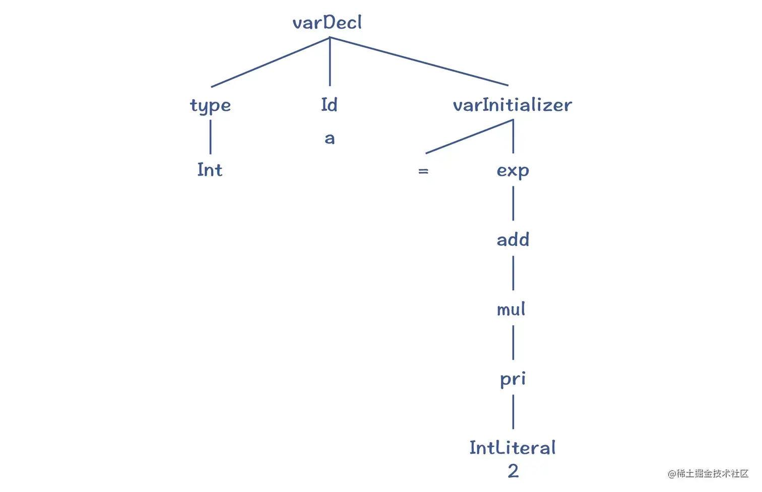 词法分析是识别一个个的单词,而语法分析就是在词法分析的基础上识别出程序的语法结构。这个结构是一个树状结构。这棵树叫做抽象语法树(Abstract Syntax Tree,AST)。树的每个节点(子树)是一个语法单元,这个单元的构成规则就叫“语法”。每个节点还可以有下级节点。