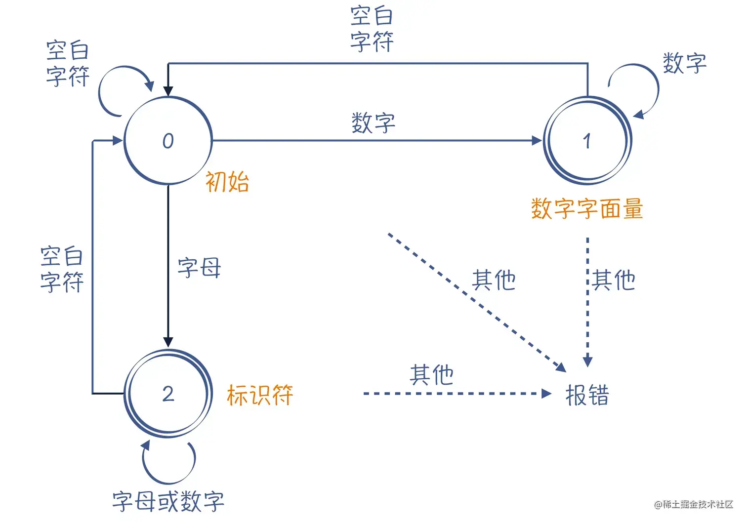 确定的有限自动机就是一个状态机,它的状态数量是有限的。该状态机在任何一个状态,基于输入的字符,都能做一个确定的状态转换。