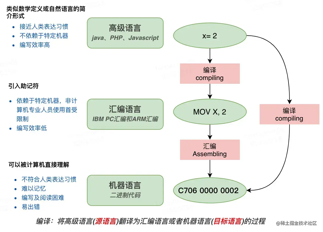 - 如果源代码编译后要在操作系统上运行,那目标代码就是汇编/机器代码。