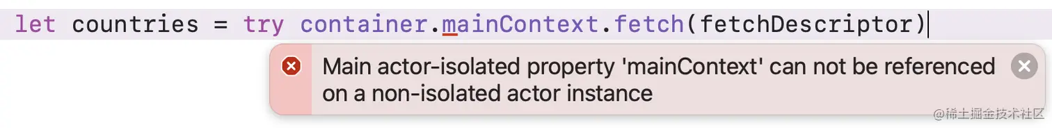 与 Core Data 类似,Model 对象和 ModelContext 都不能在 actor 之间传递(它们都不是可发送的)。与 Core Data 不同的是,Swift 编译器强制执行这些规则。例如,在不在主 actor 上时尝试访问主视图上下文将导致错误: