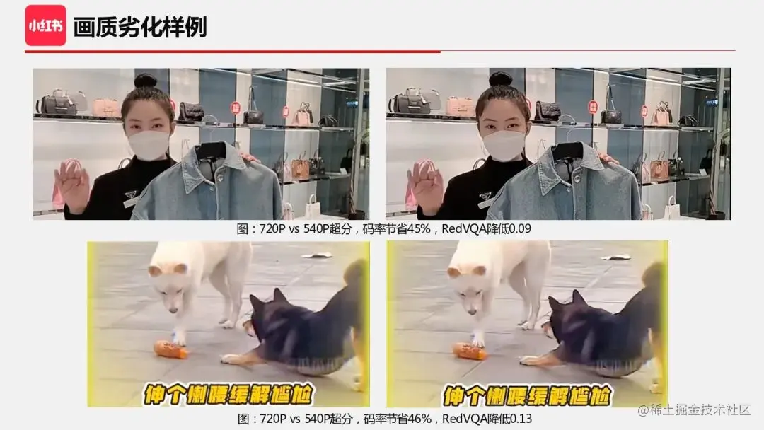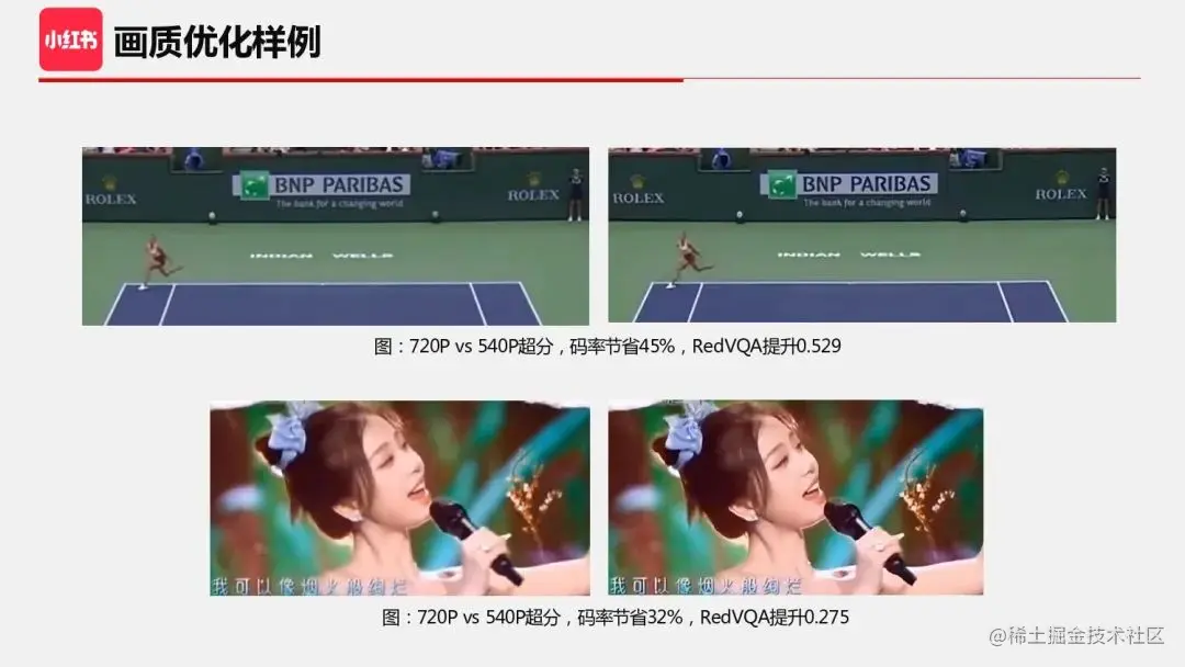 以上是两个画质优化的例子。上图超分档位码率节省 45%,RedVQA 提升 0.529;下图码率节省 32%,RedVQA 提升 0.275。从这两个例子可以看到,超分视频同时兼具了画质收益和带宽收益。