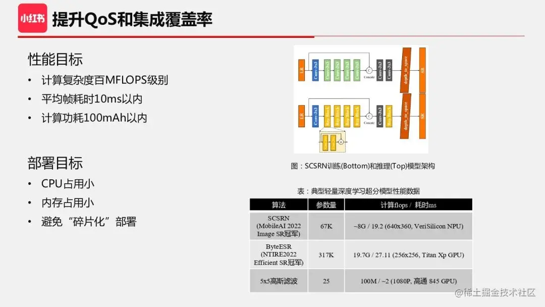 当我们设计超分算法时,首先要保证的是 QoS 数据无负向,要求开启超分后的各项技术指标不会显著劣化。而为了达到比较高的覆盖率,需要在中低端机上也能流畅的运行,这对于算法的性能提出了更高的要求。我们对算法的性能目标有个经验性的判断:计算复杂度应该在 GFLOPS 以内,耗时在 10ms 以内,功耗在 100mAh 以内,这样开启超分后的影响可能比较小。