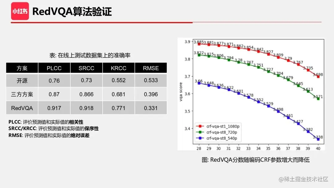接下来是算法验证。首先介绍下质量评估领域的几个评价指标,PLCC 表示相关性,SRCC/KRCC 反映保序性,RMSE 反映绝对误差。RedVQA 的相关性在 0.9 左右,达到了可用的状态。此外,我们也验证了算法对质量劣化的敏感程度,首先需要构造一批质量保序的样本。我们通过编码参数的配置得到一系列不同分辨率和码率的样本,实际线上转码服务也是基于不同分辨率以及不同的编码参数来设计转码档位,这也贴合了线上的视频处理方式。上图可以看到,随着质量控制参数 CRF 的增大,质量分逐渐减小,符合预期,说明算法可以在一定程度上捕捉一些细微的质量损失。其次,我们也看到,同一个视频的不同分辨率版本,高分辨率质量整体优于低分辨率,这也符合预期。