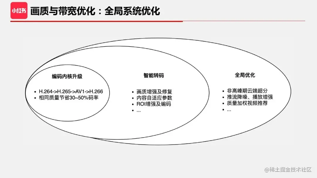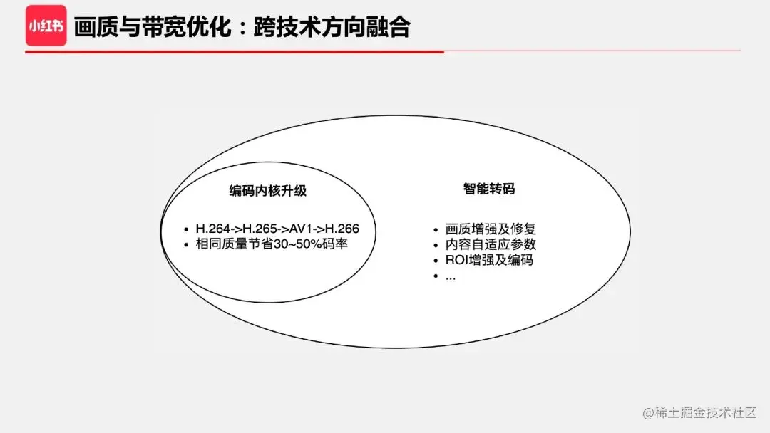 首先,大家熟知的是编码标准的迭代和升级,每一代标准相比前一代标准在画质基本不变前提下可以节省 30%~50% 的码率。当前小红书大规模部署的是 H.265 标准,目前达到比较高的覆盖率。在研主要标准是 AV1,H.266 未来也可能会跟进。