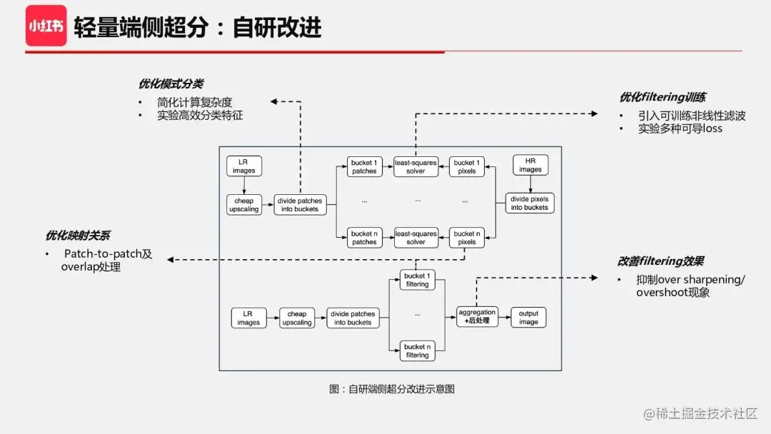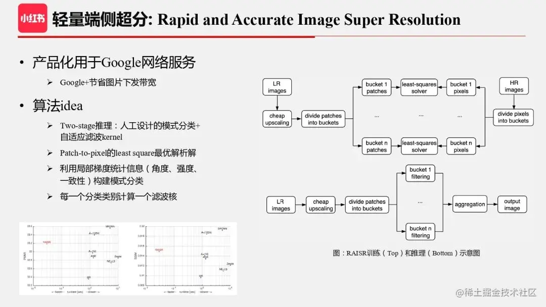 虽然可以进一步对上述算法进行模型压缩,不过我们总体判断在极轻量算法设计中,有图像理论指导的 low level 图像算法会比深度学习更高效,因此我们把目光投向超分领域更早的文献。这里列出一篇 Google 发表的很有启发意义的文献,被用于节省图片下发带宽。总体来说,这是一个 two-stage 算法,推理时先对图片 patch 进行模式分类,选出滤波 kernel,然后用这个 kernel 进行滤波,可以认为是一个内容自适应的滤波算法。在训练阶段,通过将相同分类的输入 patch 及对应的 ground truth pixel 集合在一起形成训练集,求解出 kernel。需要说明的是,这个算法的 kernel 求解不是通过梯度后向传播训练出来的,而是直接求的解析解。从左下图可以看到,这个算法在当时还是非常高效的,可以达到实时。