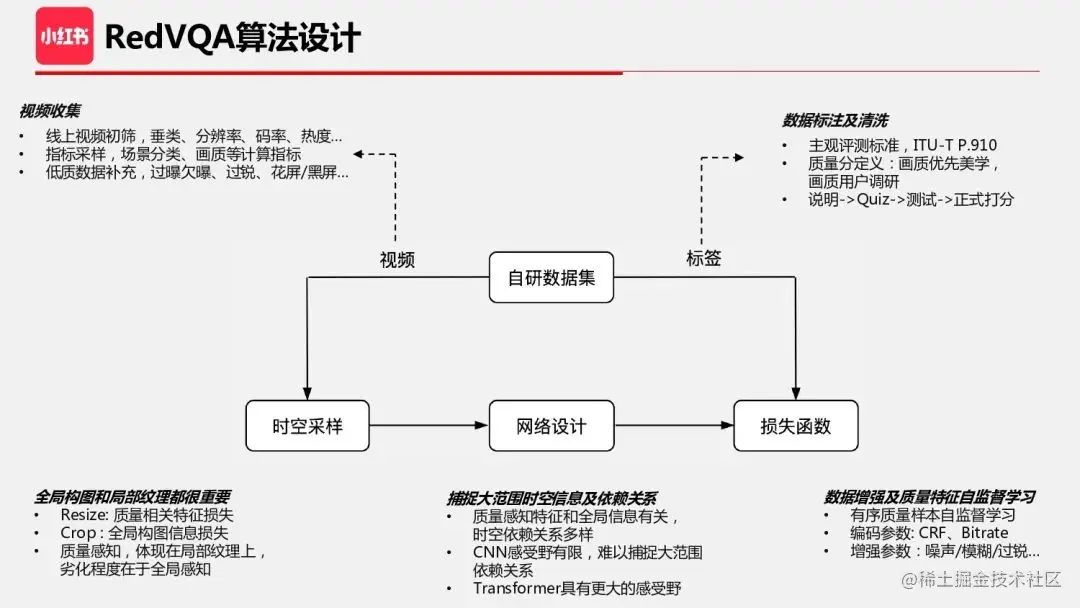 算法设计上,重点是如何有效提取质量特征,这里需要对质量问题的产生过程有充分的认知,比如视频链路中编辑和转码会如何影响质量,我总结了 3 个关键点: