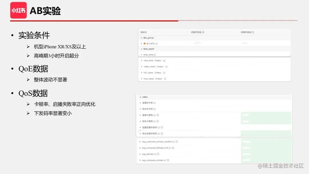 我们也做了 AB 实验佐证大盘上的表现。实验条件是基于 iPhone XR/XS 及以上开启超分,在带宽高峰 3 小时下发超分档位。实验结果还比较正向,QoE 数据整体波动,说明超分整体效果基本没大的问题,QoS 数据在卡顿率、启播失败率等技术指标上有显著优化,下发码率及带宽节省也比较显著。